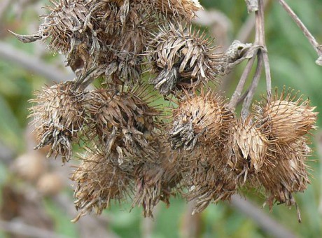 Uschlé květy lopuchu plstnatého (Arctium tomentosum), který rostl ve velkém množství podél cesty. Jedná se o známou léčivku využívající se na poruchy trávicího traktu, revma, posílení organismus, kožní problémy, močové kameny a narušený metabolismus.