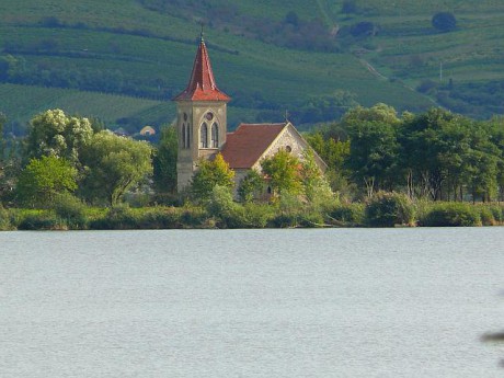 Výhled na tzv. Kostelní ostrov, kde stojí kostelík sv. Linharta. Jedná se o jediný pozůstatek zaniklé zatopené obce Mušov, která leží pod vodní hladinou. Ač to možná z tohoto záběru nevypadá, jedná se o malý ostrůvek.