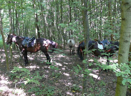 V lese jsme objevili koně bez dozoru. Tomu úplně vlevo se podařilo uvolnit a utekl. Když jsme jim to na hradě oznámili, majitel hned uháněl pro zaběhlíka. Brzy ho našel a my se pak opět potkali na hradě.