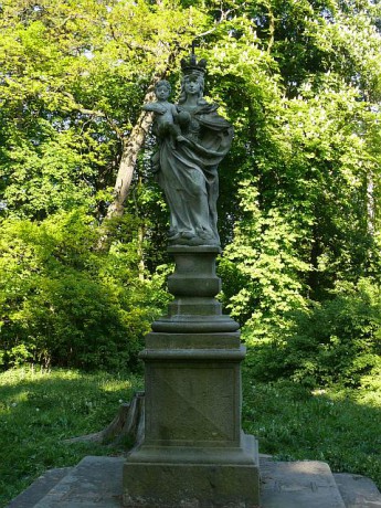 Nejdříve jsme si mysleli, že by se mohlo jednat o sv. Barboru, které je zasvěcena kaple. Ta ale bývá ztvárněna spíše s kalichech s hostií, případně s mečem a věží. Proto jsme přesvědčeni, že se jedná o Pannu Marii.