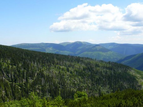 Výhledy z terasy Labské boudy, kde jsme se občerstvili. Pokud se pozorně podíváte, v levé polovině snímku objevíte i špičku Sněžky.