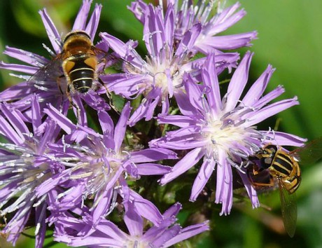 Zde si květy mléčivce alpského (Cicerbita alpina) vyhlédly pestřenky. Vypadá to, že vpravo dole se bude jednat o pestřenku červenonosou (Helophilus trivittatus) a vlevo nahoře o pestřenku trubcovou (Eristalis tenax).