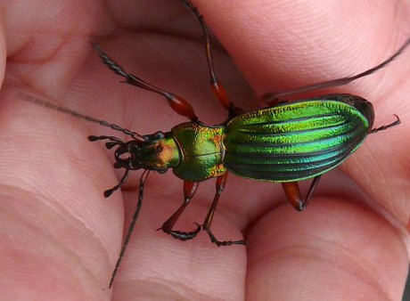 Střevlíka zlatolesklého (Carabus auronitens) vždy alespoň 1x během našeho pobytu v Krkonoších potkáme. Jedná se o horského střevlíka, který se nám špatně fotí, protože je jako z divokých vajec. Tentokrát se nám podařily jen 2 snímky a tenhle je ten lepší.
