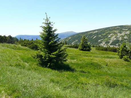 Po cestě od Luční boudy na Kozí hřbety jsou krásné výhledy, v tomto případě na Stříbrný hřbet (vpravo) s Čertovým návrším a uprostřed se schovává vrchol Sněžných jam s Vysokým kolem.