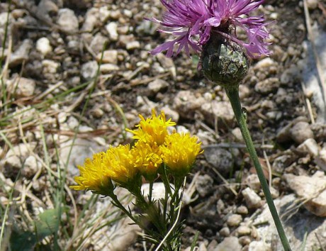 Hvězdnice zlatovlásek (Aster linosyris) - její květní úbory téměř vždy nemají vyvinuty jazykovité květy. Pokud se tak někdy výjimečně stane, pak jsou bílé nebo nafialovělé. Na pozadí barevně kontrastuje chrpa.