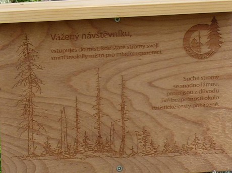 Tabule NP Šumava nás upozorňuje, že se nacházíme v místech, kde staré stromy odumřely a uvolňují místo nové generaci. Staré odumřelé stromy jsou zde pokáceny, pokud by měly ohrožovat bezpečnost turistů.