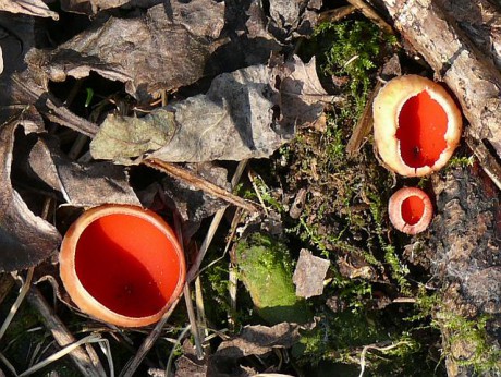 Ohnivec šarlatový (Sarcoscypha coccinea) roste už od konce února, ale maximálně do května. Roste zdánlivě ze země nebo z mechu, ale fakticky z tlejícího dřeva. Potřebuje, aby dřevo bylo doslova nacucané vodou, a tyto podmínky vytváří tající sníh.