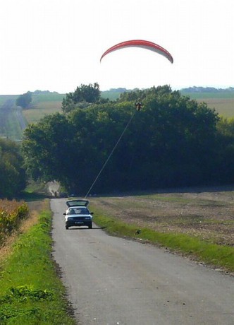 Po cestě jsme potkali paraglidisty. Tito hazardéři se dostávali do vzduchu pomocí odvíjáku (bubnu s ocelovým lankem), který měli hozený v otevřeném kufru auta. V kufru seděla obsluha odvíjáků... Otevřený kufr je ze snímku patrný.