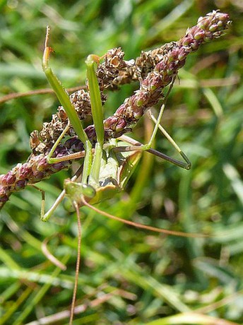 Kousek před námi přistála na jitroceli přímořském kudlanka nábožná (Mantis religiosa). Ještě měla letní světle zelené zbarvení, které se na podzim mění na hnědou. Díky zabarvení ji v přírodě můžete lehce přehlédnout...