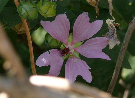 Slézovec durynský (Lavatera thuringiaca) je z pohledu ochrany zařazen mezi druhy naší květeny vyžadující další pozornost. Na květu se nám k focení připletla ruměnice pospolná (Pyrrhocoris apterus), která se nejvíce živí šťávami rostlin.