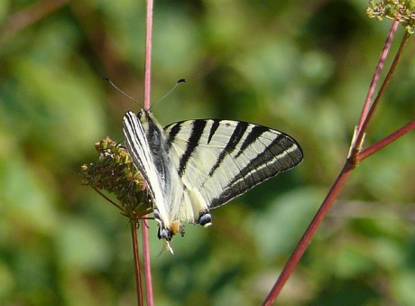 Otakárek ovocný (Iphiclides podalirius) má zadní křídla s dlouhými ostruhami, před kterými má červeno modrou skvrnu ve tvaru oka a modré srpky. V tomto případě ale měl na pravém křídle ostruhu vykousnutou.