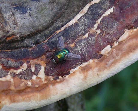 Troudnatec pásovaný (Fomitopsis pinicola) je hojná dřevokazná houba, která se dříve využívala k rozdělání ohně. Roste téměř po celý rok na živých i odumřelých větvích, kmenech a pařezech. Tentokrát v něm našla zalíbení bzučivka zelená (Lucilia sericata).
