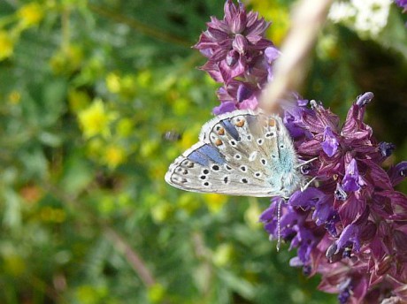 Modráska jetelového (Polyommatus bellargus) už známe právě z Podyjí z našich dřívějších výletů. Jedná se o dvougeneračního motýla, který nás zmátl "modrými pásky" na rubu křídel. Až po chvíli jsme si uvědomili, že modré pásky vznikly oškubanými křídly.;-)