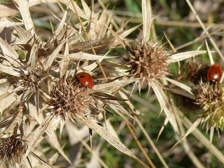 Slunéčko sedmitečné (Coccinella septempunctata) jsme objevili na odkvetlé máčce ladní. Než slunéčko dospěje, spořádá až 600 mšic. Je-li samo v ohrožení, vylučuje oranžovou šťávu obsahující alkaloidy, čímž se stává pro predátory nechutné a odradí je.