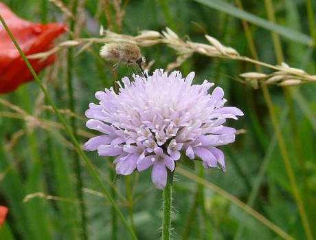 Dlouhososka velká (Bombylius major) na chrastavci - dlouhososka je velmi dobrý letec. Během letu umí sát nektar jako kolibřík. Většinou bývá vidět od března do května. Vzhledem k letošnímu chladnému jaru jsme ji potkali i na konci června.