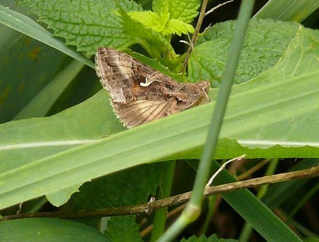 Zde se před námi schovával kovolesklec gama (Autographa gamma). Zemědělci považují tuto můru za škůdce, neboť napadá řepu, len a další plodiny. Snižuje cukernatost i celkové výnosy. Jedná se o teplomilného motýla, který k nám migruje z jižní Evropy.