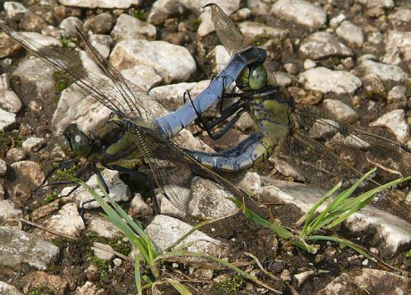 Kopulující vážky černořitné (Orthetrum cancellatum) - samec (nahoře) má 2 kopulační orgány. První se spermatem má na konci zadečku. Druhý, který slouží k vlastní kopulaci, má mezi 2. a 3. článkem zadečku. Před kopulací si sperma přenese z 1. na 2. orgán.