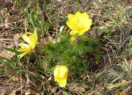 ... a hned potkáváme kvetoucí hlaváčky jarní. Hlaváček jarní (Adonis vernalis) je jedovatá pryskyřníkovitá rostlina, která má v oblibě vysluněné teplé stráně. Hlaváček obsahuje glykosidy, které působí obdobně jako glykosidy náprstníku.