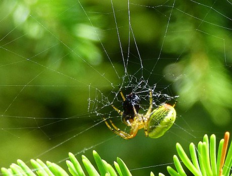 Křižák zelený (Araniella cucurbitina) není až takovou vzácností a je na horách i ve vyšších polohách poměrně hojný. Pavouk je téměř celý zelený, ale na konci zadečku má nenápadnou rudou skvrnu.