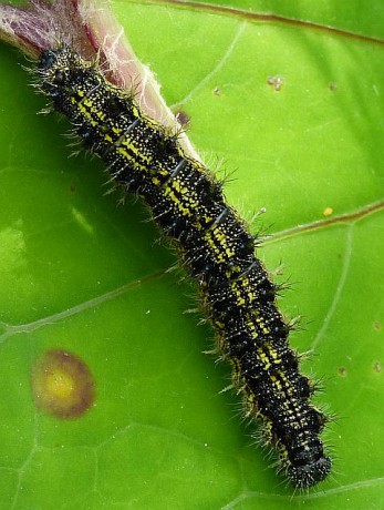 Housenka babočky kopřivové (Aglais urticae) po svém vylíhnutí z vajíčka sežere jeho zbytky a začne produkovat vlákno na hnízdo. V období 1. instaru se housenky zdržují ve společných hnízdech, později v malých skupinkách nebo i samostatně.