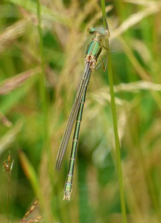 Šídlatka velká (Chalcolestes viridis) je naše největší šídlatka. Obě pohlaví mají hruď i zadeček zelený bez modravého ojínění. Jedná se o druh vyhledávající stojaté nebo mírně tekoucí vody, ale mimo hory. Proto nás zde šídlatka trochu překvapila.