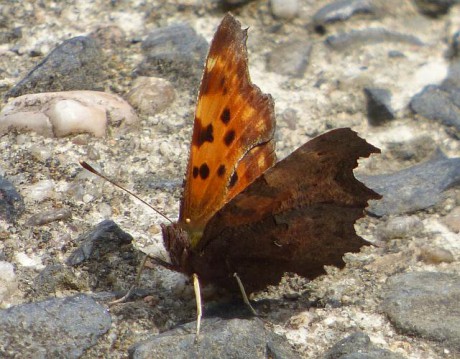 Babočka bílé C (Polygonia C-album) navštěvuje ráda květy bohaté na nektar, ale saje i mízu stromů nebo šťávu ovoce. Její poznávací znaky jsou hluboce vykrajované okraje křídel a bílá skvrna na rubu zadního křídla připomínající písmeno C.