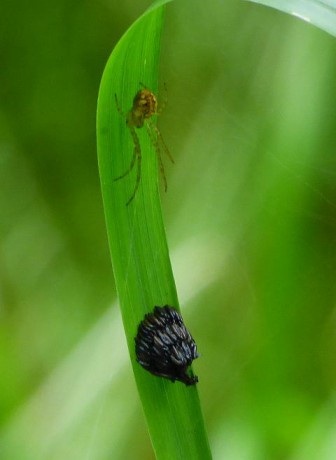 Opět jsme přemýšleli (už jednou jsme na stejnou záležitost narazili v Jeseníkách), co to pavouk křižák hlídá. Víme, že samice klade vajíčka až na konci léta do kokonu. Pokud někdo znáte vysvětlení, ozvěte se.