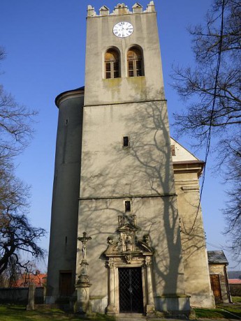 U kostela nelze přehlédnout hranolovitou věž s ozubeným cimbuřím, která se dost liší od tradičních kostelních věží. Na severní straně věže (v tomto případě vlevo) se nachází boční kulatá věž, která asi byla původně hláska.