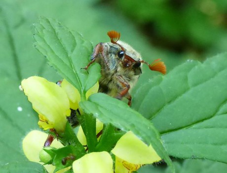 Chroust obecný (Melolontha melolontha) se líhne až koncem léta nebo na podzim. Poté přezimuje v kukelní komůrce. U nás se jedná o hojného brouka, který se často přemnožuje. Zde se mu zalíbilo na pitulníku nebo-li hluchavce žluté.