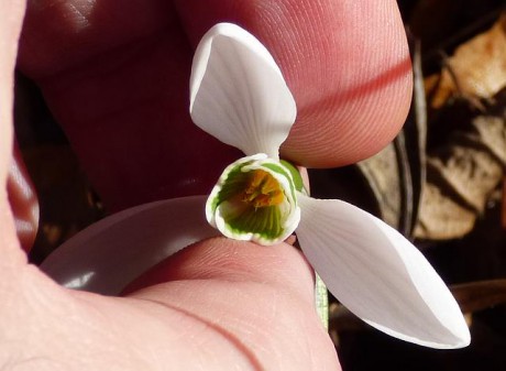 Pohled do květu sněženky podsněžníku (Galanthus nivalis), který je složen z bílých delších vnějších okvětních lístků a z kratších vnitřních bílých. Právě tyto kratší okvětní lístky mají při okraji zelený lem. Tyčinek je 6 a prašníky jsou výrazně žluté.