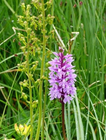 Zde se nám na jednom snímku podařilo zachytit rovnou dvě orchideje: vlevo bradáček vejčitý (Listera ovata), slovensky bradáčik vajcovitolistý, vpravo prstnatec Fuchsův (Dactylorhiza fuchsii), slovensky vstavačovec Fuchsov.