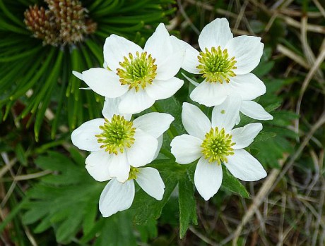 Sasanka narcisokvětá (Anemone narcissiflora), slovensky veternica narcisokvetá, která je v našem Červeném seznamu řazena mezi kriticky ohrožené rostliny. My ji známe od nás z Krkonoš.