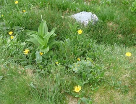 Na snímku lze vidět kýchavici bílou Lobelovu (Veratrum album subsp. lobelianum), slovensky kýchavica biela Lobelova, kamzičník Clusiův (Doronicum clusii), slovensky kamzičník Clusiov, sasanku narcisokvětou (Anemone narcissiflora), slovensky veternica ...
