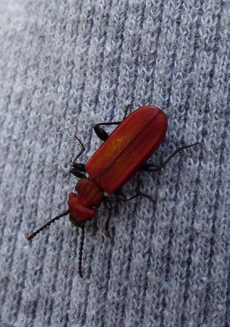 Lesák rumělkový (Cucujus cinnaberinus) je legislativou řazen mezi silně ohrožené druhy. V červeném seznamu je veden jako ohrožený druh. V tomto případě přistál na ruce Ivči. My jsme ho nafotili poprvé.