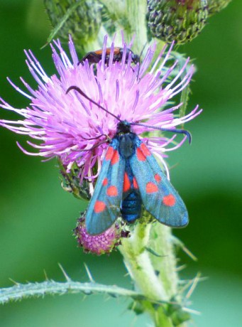 Pět teček má na křídlech více vřetenušek. V tomto případě jsme váhali mezi vřetenuškou mokřadní a pětitečnou. Vzhledem k malé velikosti 3. tečky a její izolovanosti od 4. se domníváme, že je zde zachycena vřetenuška pětitečná (Zygaena lonicerae).