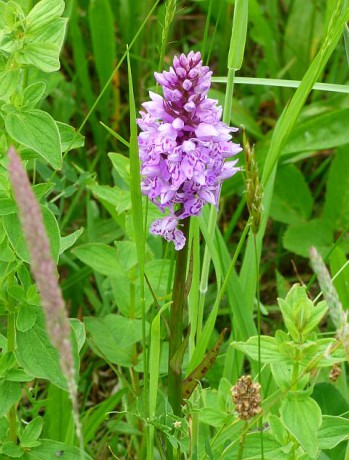 Prstnatec Fuchsův (Dactylorhiza fuchsii) roste u nás roztroušeně zejména v horských oblastech. Na této fotografii jsou dobře vidět zelené listy, které jsou skvrnité. Skvrny jsou oválné až podlouhlé s delším rozměrem kolmo k ose listů.