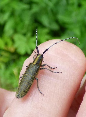 Tesařík úzkoštítý (Agapanthia villosoviridescens) má jednoletý vývoj. Samice nakousne část osy hostitelské rostliny a do štěrbiny naklade vajíčko. Larva si po vylíhnutí vykusuje v ose chodbu a kuklí se v nadzemní části osy v komůrce.