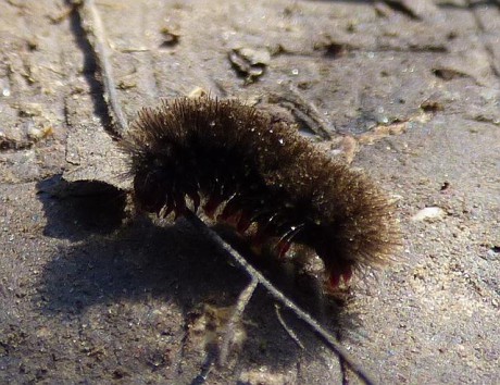 Na cestě jsme potkali housenku běloskvrnáče pampeliškového (Amata phegea). Jedná se o denního motýla z čeledi přástevníkovitých, kterého z našich stránek již znáte (černo-modrý motýl se žlutými proužky na zadečku a bílými oválnými skvrnami na křídlech).