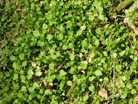 Hned na okraji lesa nás zaujaly velké zelené koberce. Až jsme přišli blíže, zjistili jsme, že se jedná o poléhavý ptačinec prostřední nebo-li ptačinec žabinec (Stellaria media). V některých případech už rozkvétal.